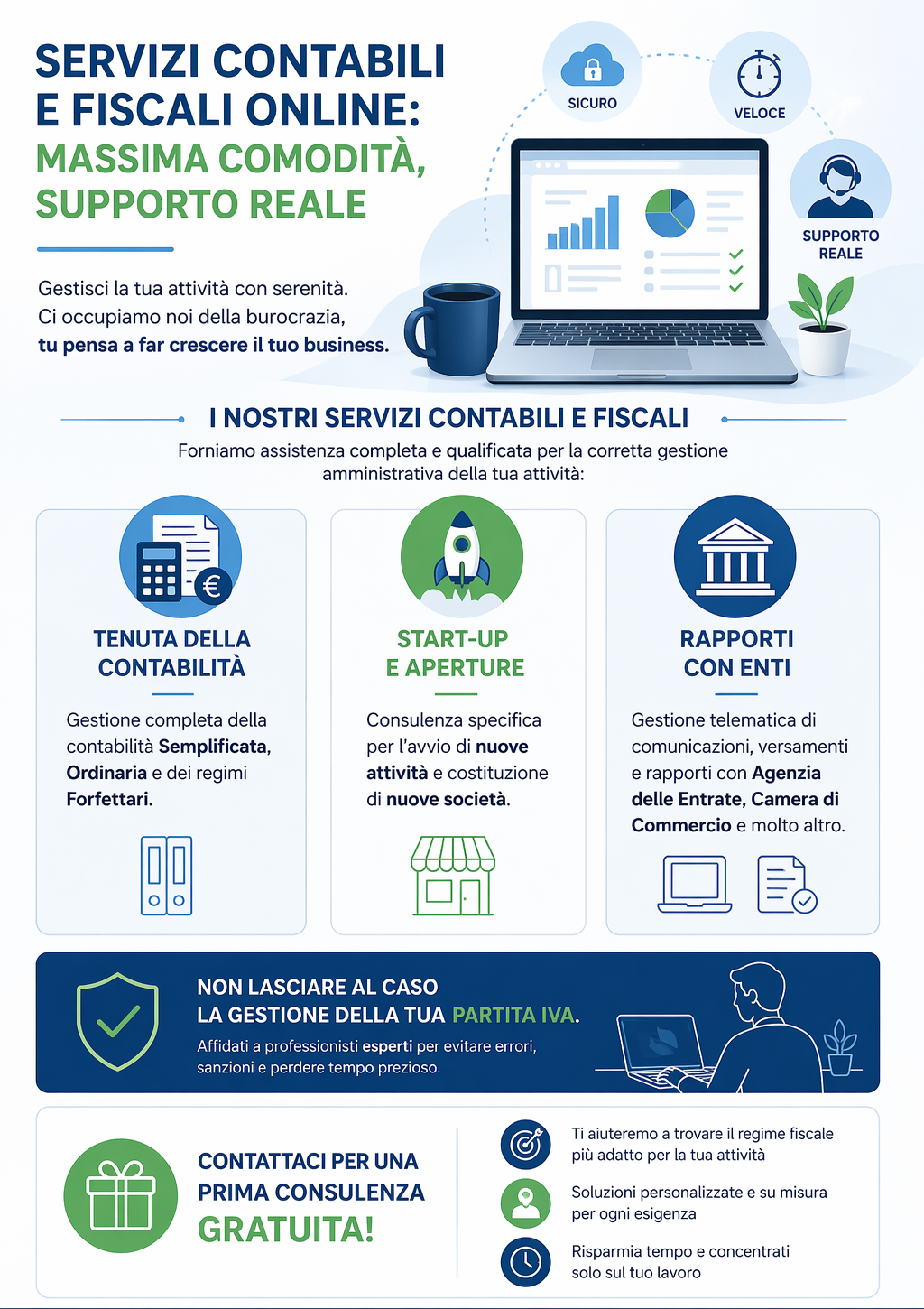 Gestisci la tua attività senza pensieri: ci occupiamo noi di contabilità e adempimenti, con soluzioni digitali e assistenza professionale continua.
